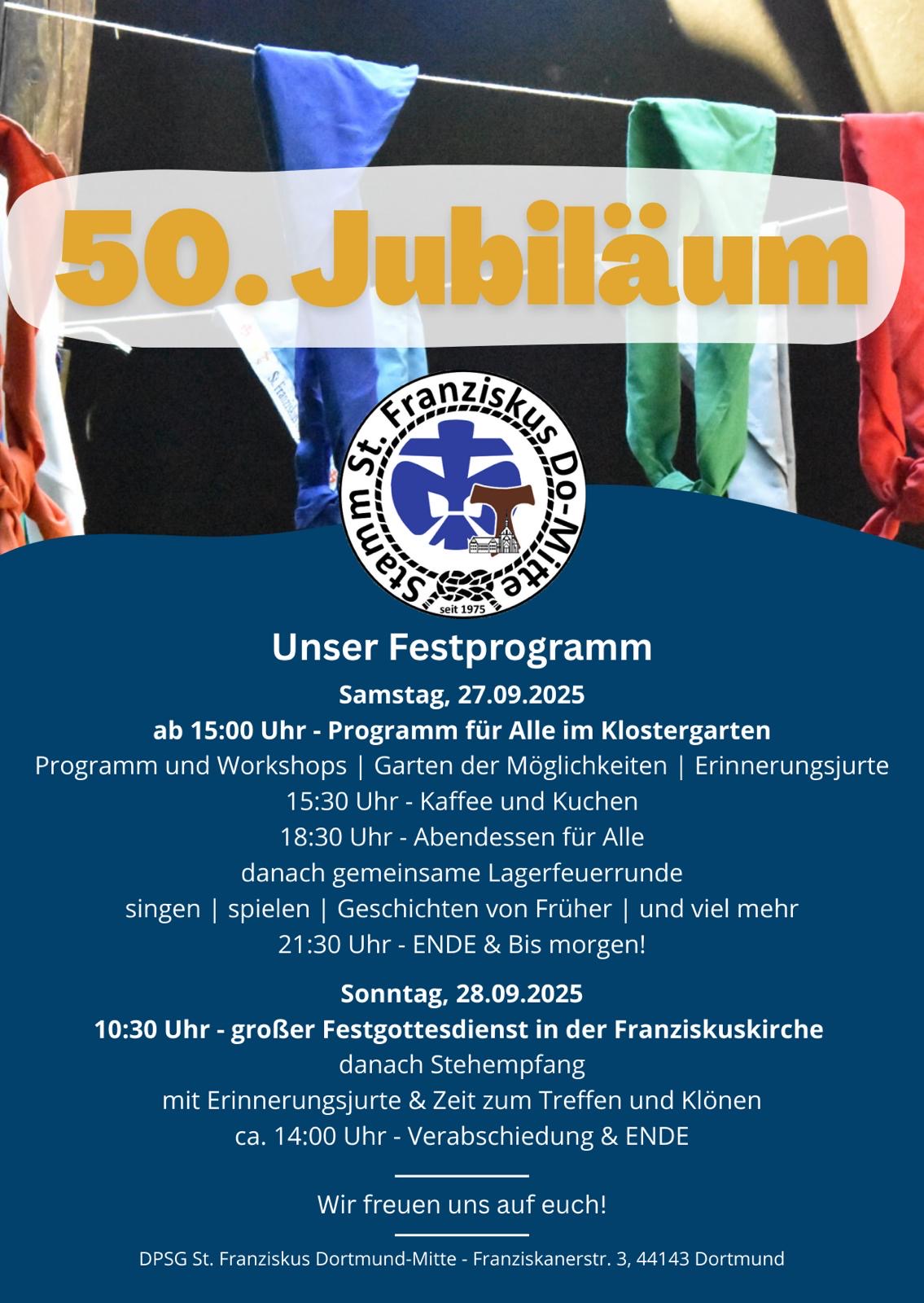 Die Pfadfinder des Stammes St. Franziskus Dortmund-Mitte feiern vom 26. bis 28. September 2025 ihr 50-jähriges Jubiläum. Zu diesem besonderen Anlass schlägt der Stamm sein Herbstlager im Klostergarten auf.